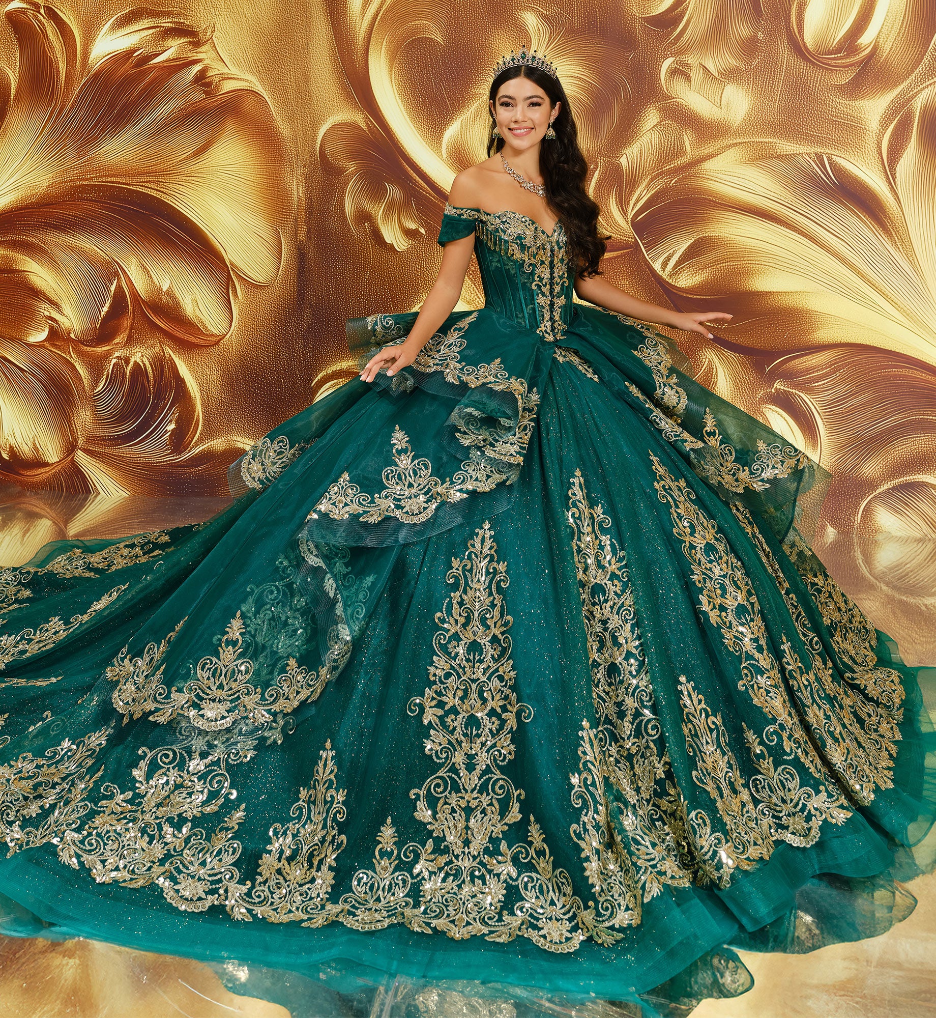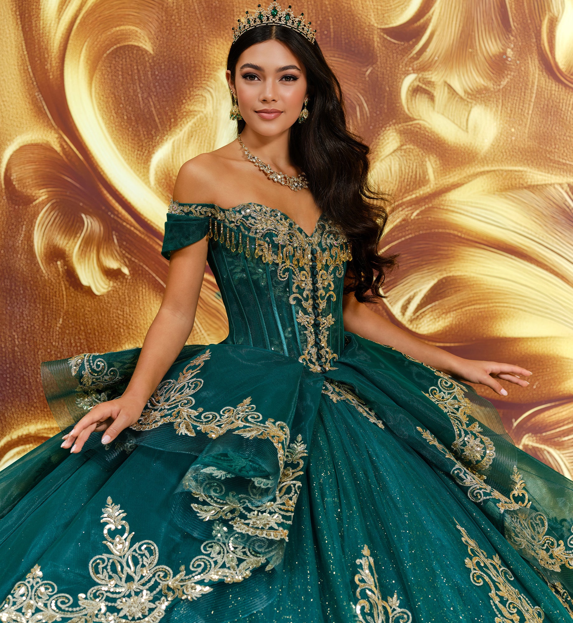 Quinceañera ball gown with a dramatic princess silhouette and an elegant off-the-shoulder neckline. The fitted bodice is richly decorated with intricate embroidery and shimmering details, flowing seamlessly into a voluminous skirt adorned with regal patterns. A statement bow at the back and luxurious layers complete the look, creating a truly royal style for a once-in-a-lifetime celebration.