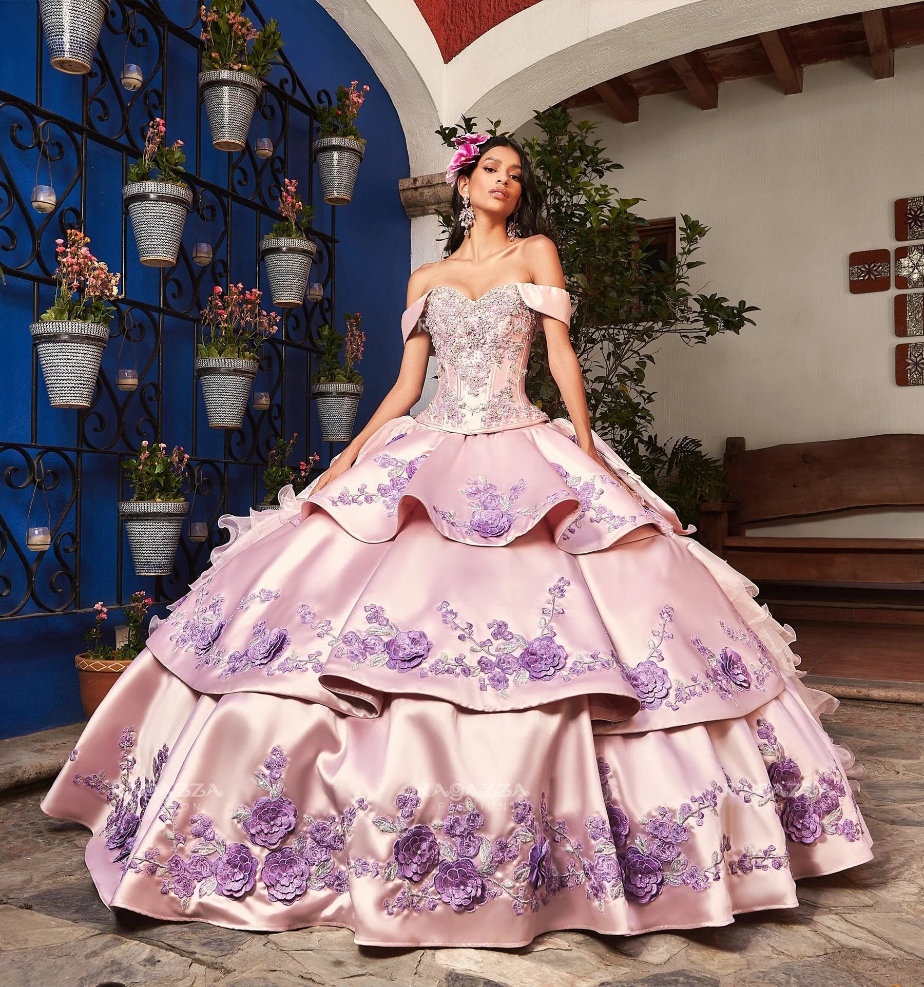 Step into the spotlight with this enchanting Tiered Floral 2-Piece Quinceanera Dress by Ragazza M47-147. Featuring a strapless sweetheart bodice with corset boning and an open lace-up back, this gown offers a flattering fit and a touch of drama. The floor-length A-line tiered skirt with ruffles and a sweep train adds playful movement, while detachable off-the-shoulder sleeves let you switch up your look effortlessly. Available in dreamy Rose Quartz Pink and Lilac, this dress is perfect for dancing the night away in style and grace.